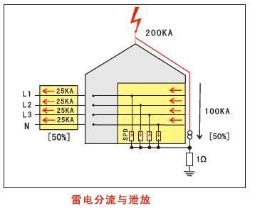 根據(jù)IEC62305-1,最大的測試雷電流為200KA,當它擊在建筑物的接閃裝置上,其中一半的雷電流會通過引下線直接入地,其余一半的雷電流會通過與建筑連接的線纜向建筑物中泄放。對于一個三相TN-C-S系統(tǒng),其電源進線為4線,平均每線分流為25KA。因此,若對電源系統(tǒng)做防雷保護時,采用放電電流能力為25KA(10/350us)的雷電電涌保護器就已經(jīng)足夠了。