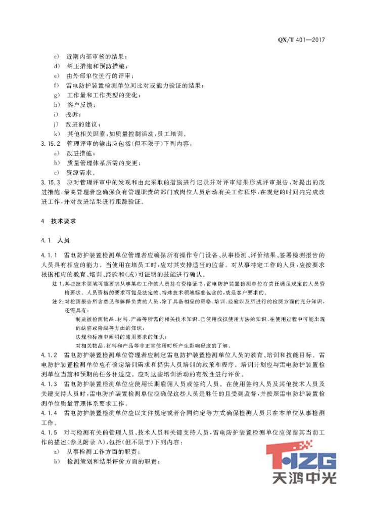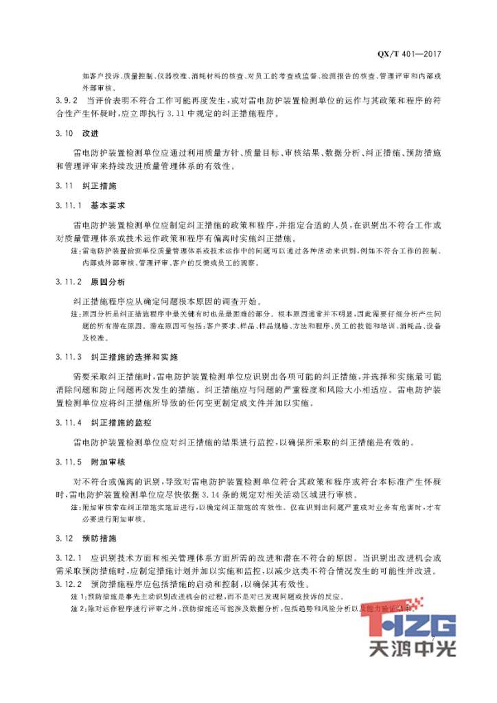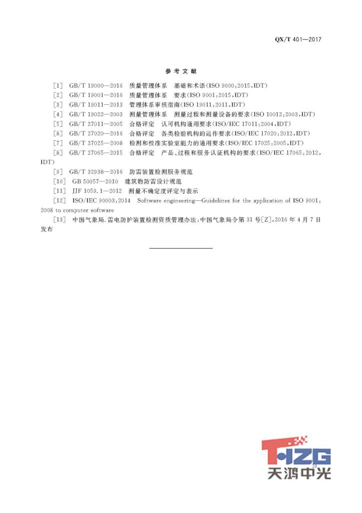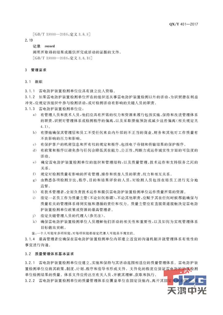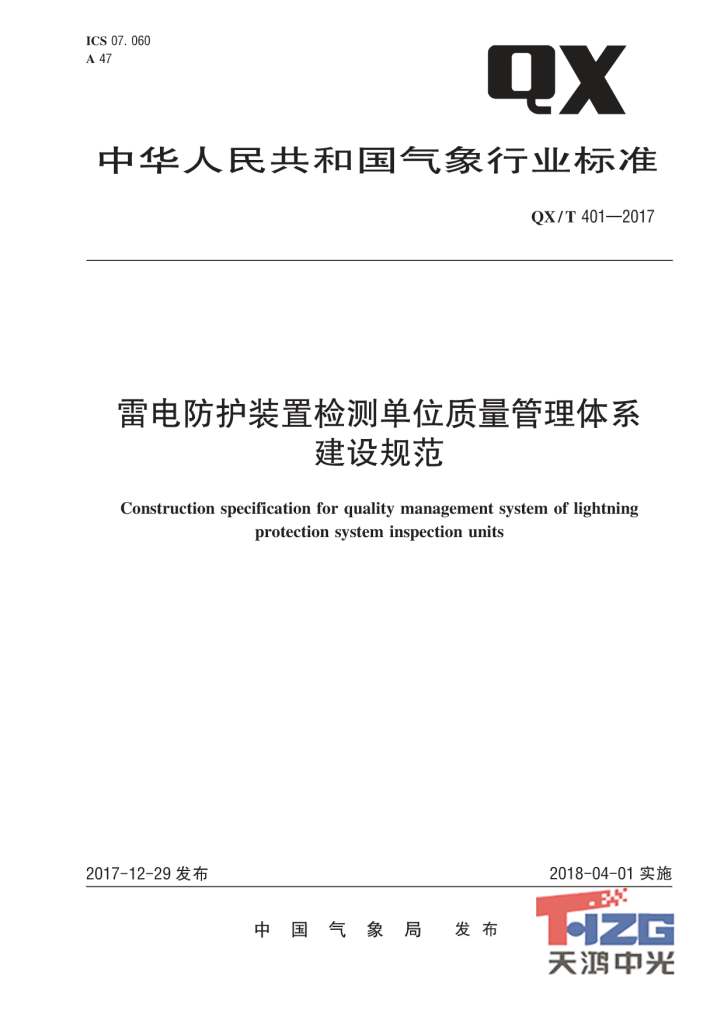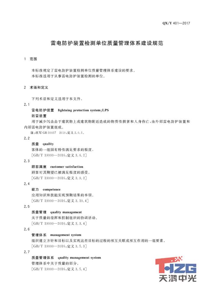 雷電防護(hù)裝置檢測(cè)單位質(zhì)量管理體系建設(shè)規(guī)范 QX/T401-2017